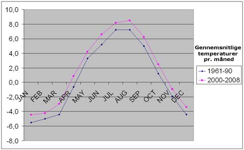 Sommertemperaturerne varierer en del i Sydvestgrønland. Der er således en relativt stor forskel mellem stationer placeret i indlandet (Narsarsuaq) og kystområderne samt de ydre fjordområder (Upernaviarsuk/Nanortalik/Alluitsup Paa). Vintertemperaturerne er ca. -7EC for koldeste måned i de indre fjordområder. De ydre fjordområder har et varmere vinterklima med laveste temperaturer på ca. 5E-6EC. Sommertemperaturerne i den varmeste måned er på ca. 7E-8EC i de ydre sydgrønlandske fjordområder (Upernaviarsuk); stigende ind mod fjordbundene til 10E-11EC (Narsarsuaq).